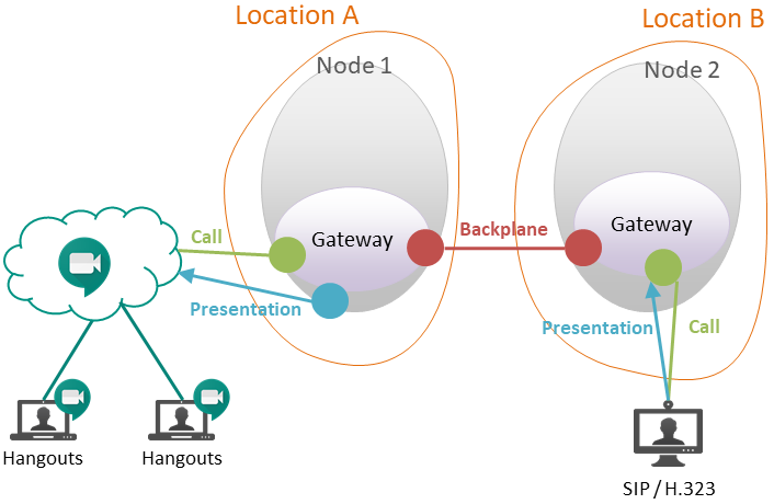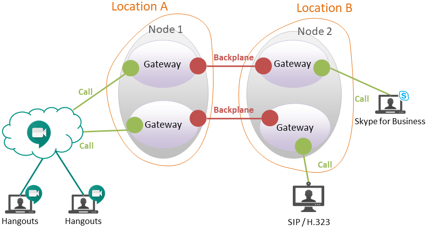 • Two gateway calls are placed to the same Google Meet meeting connected via node 1: one from a standards-based endpoint connected via node 2, and one from a Skype for Business client also connected via node 2.