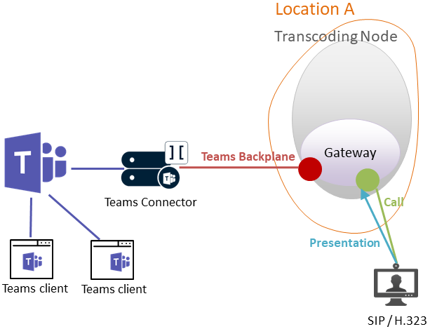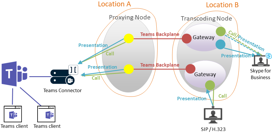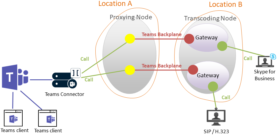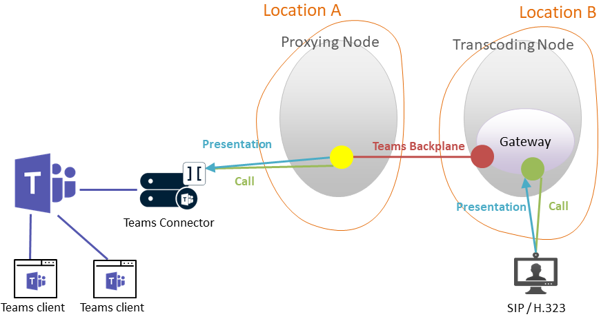 • A gateway call is placed from a standards-based endpoint connected to the transcoding node to a Microsoft Teams meeting. The call is routed via the proxying node and the Teams Connector.