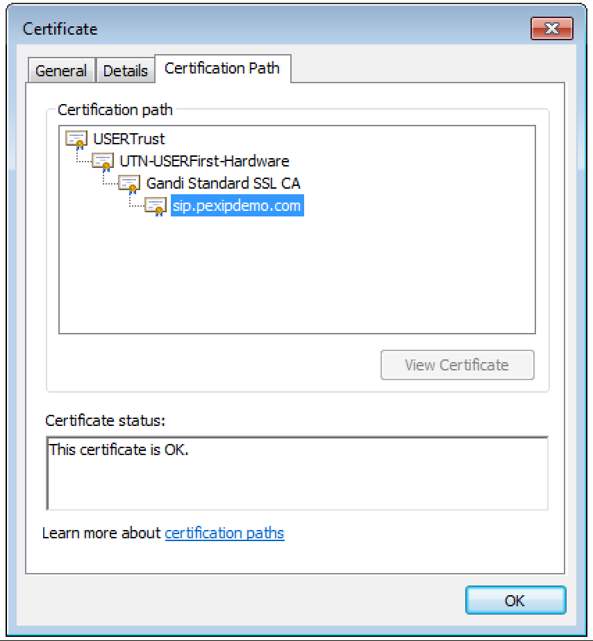 In the example below, the certificate for sip.pexipdemo.com has been issued by the intermediate CA Gandi Standard SSL CA, which is a subordinate CA for UTN-USERFirst-Hardware, which in turn is a subordinate CA for USERTrust, which is the root CA in this case: