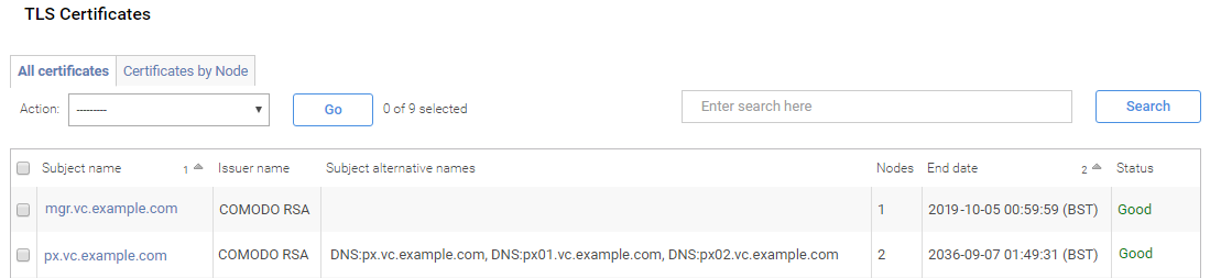 | Subject alternative names | px01.vc.example.com, px02.vc.example.com, vc.example.com (and px.vc.example.com will also be included automatically) | conf01.vc.example.com, conf02.vc.example.com, conf03.vc.example.com (and confpool-eu.vc.example.com will also be included automatically) |