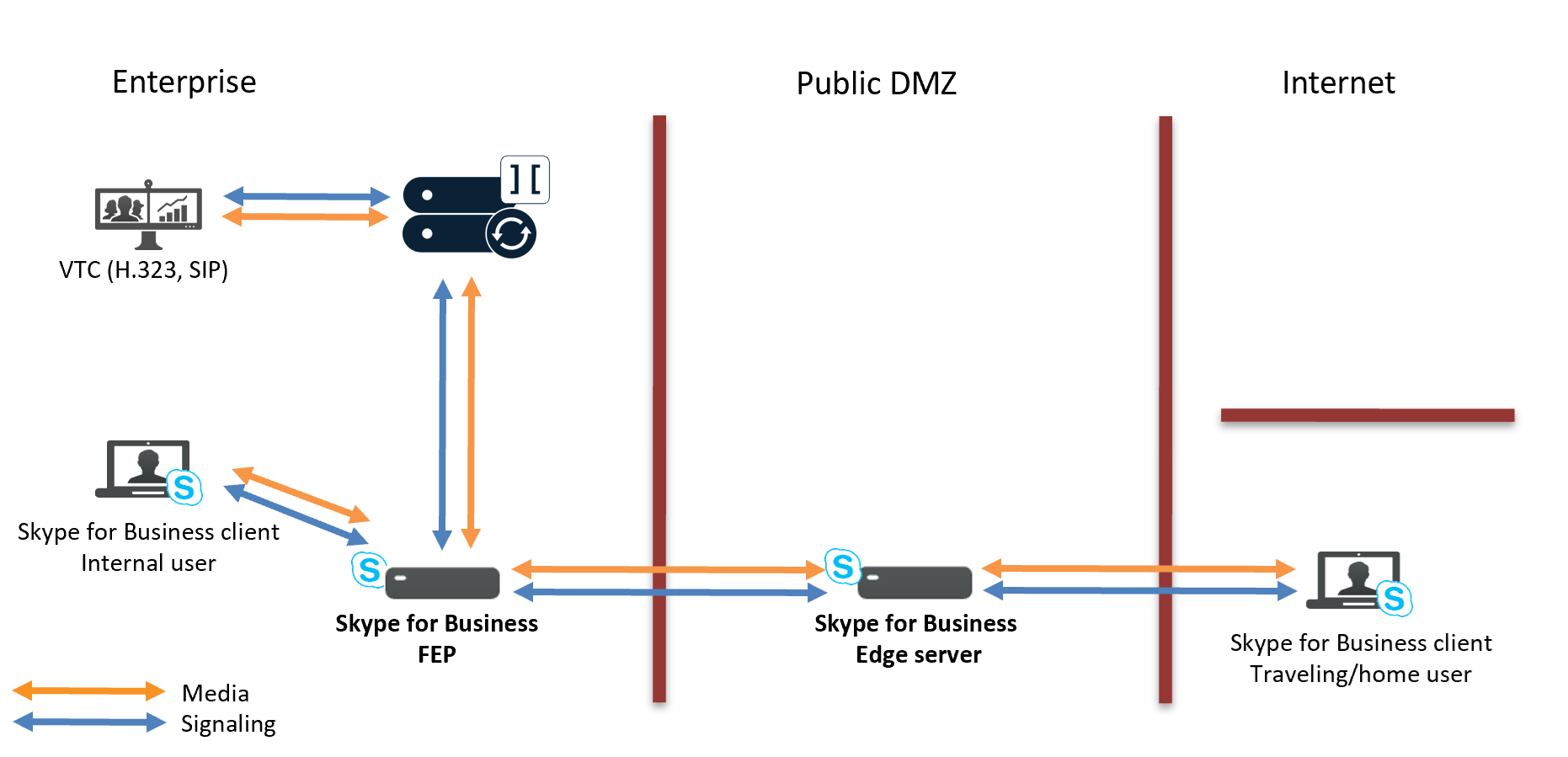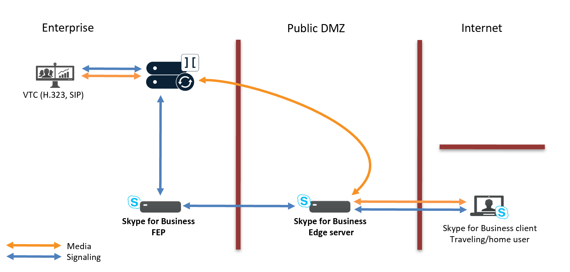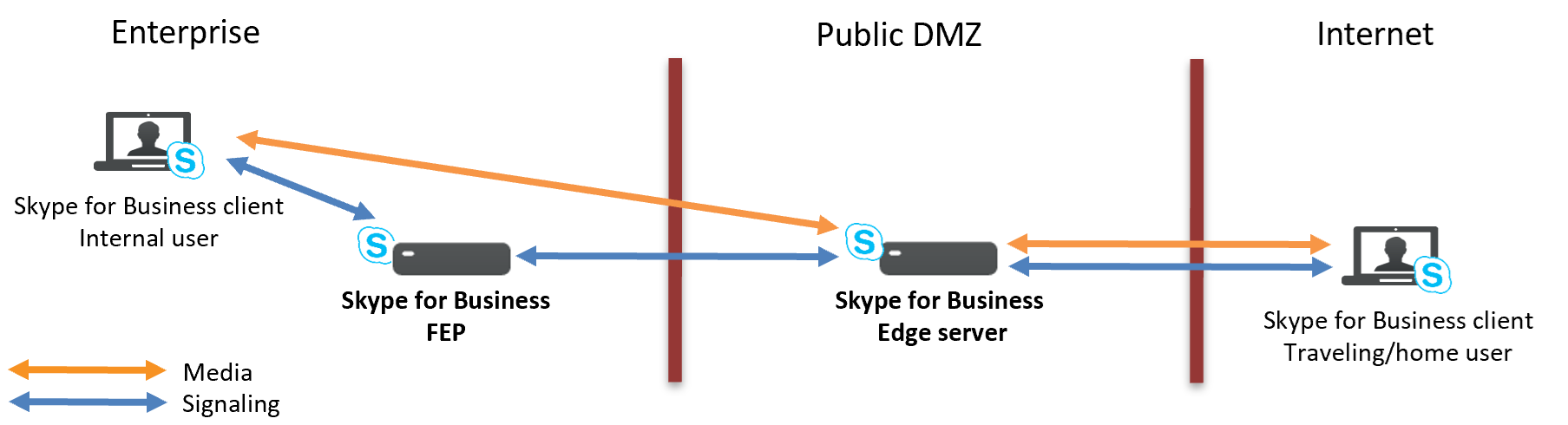 - Signaling goes via the SfB Front End Pool (FEP) and SfB Edge server.