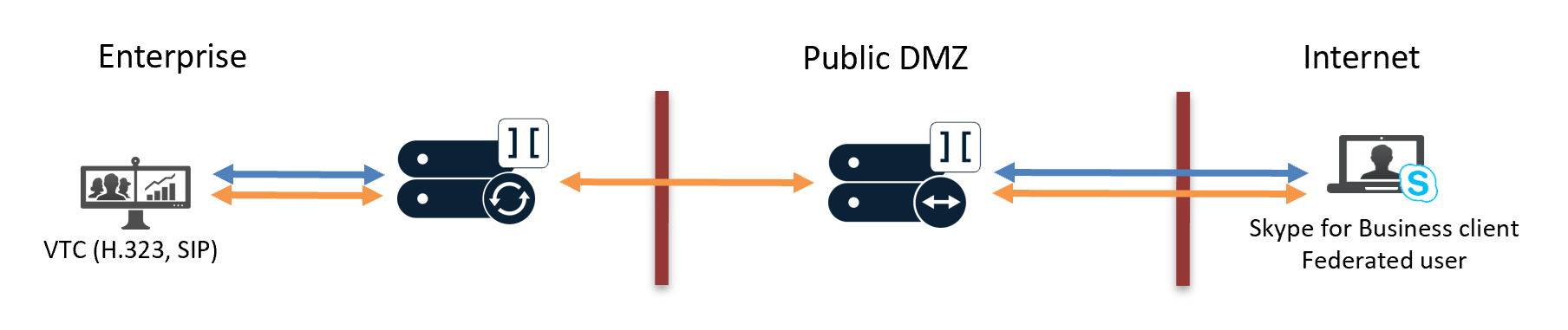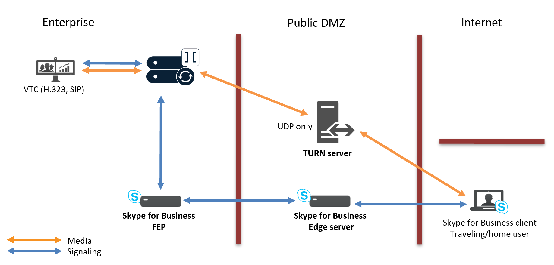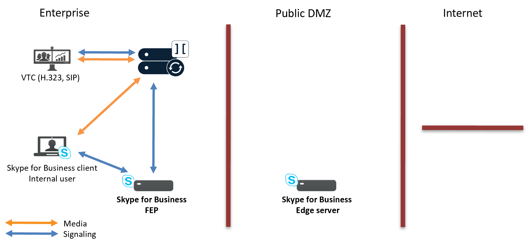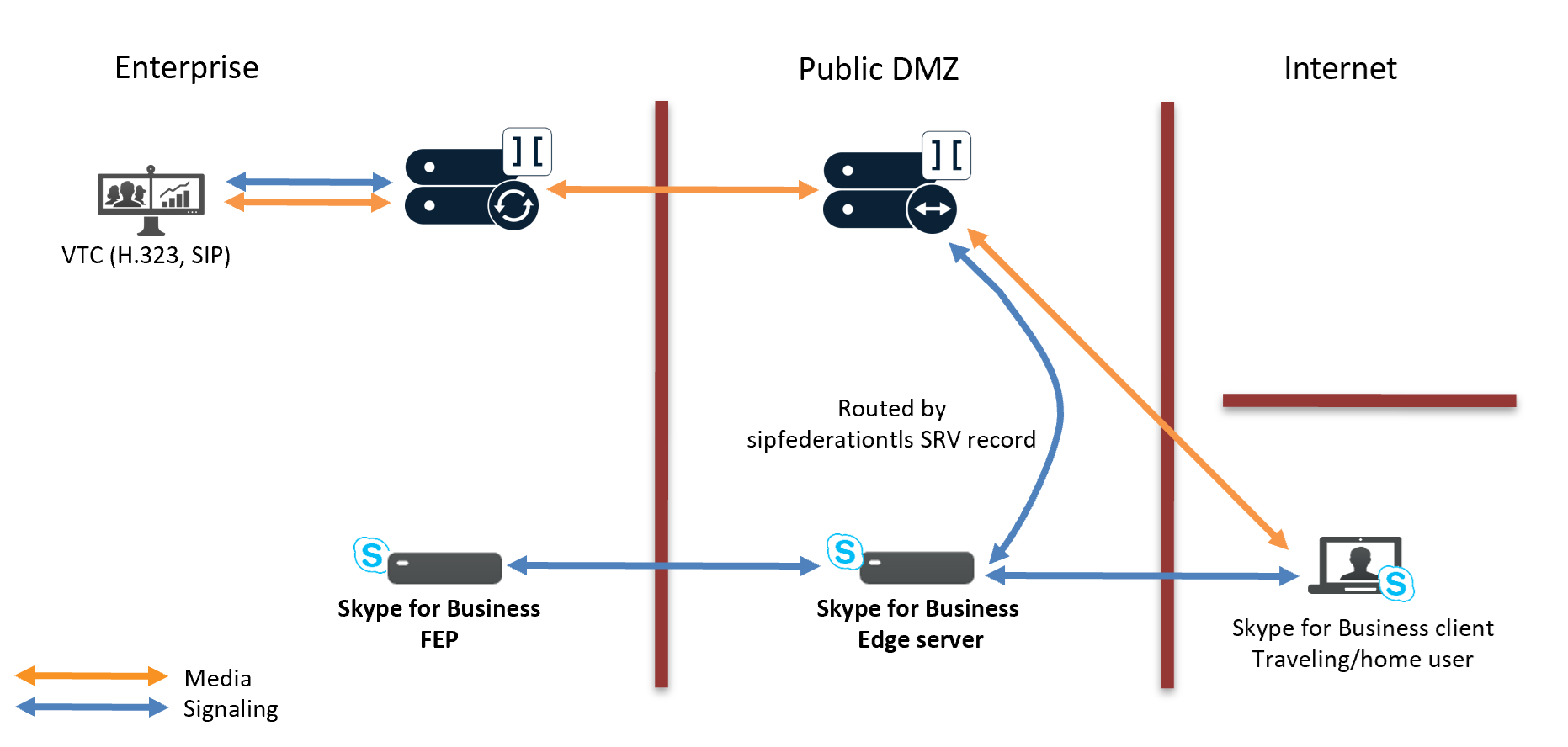 - Signaling goes via the SfB Front End Pool (FEP) and SfB Edge server.