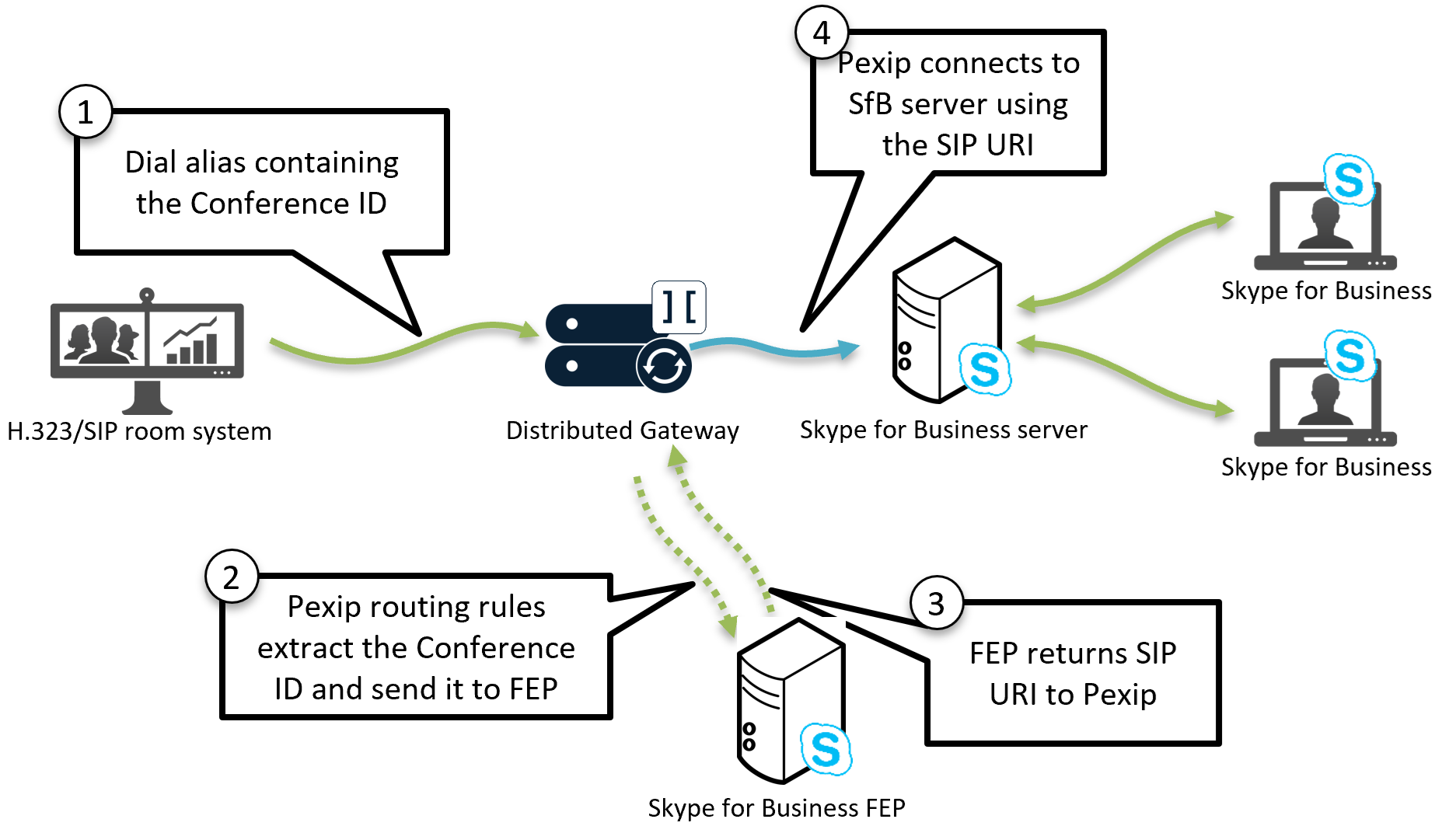 In addition to Pexip Infinity acting as a point-to-point gateway between non-SfB devices (such as SIP and H.323 endpoints or Pexip apps) and SfB clients, you can also configure the Infinity Gateway so that it can route calls from those external devices directly into ad hoc or scheduled SfB meetings.