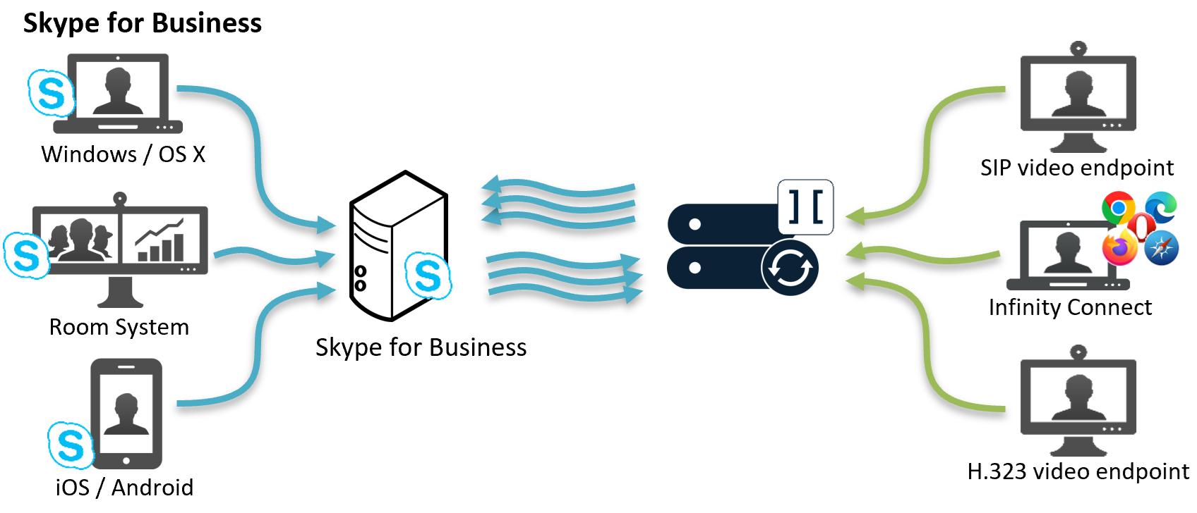 Pexip Infinity can act as a gateway between Skype for Business and standards-based endpoints. This enables SfB clients to: