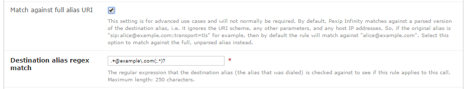 Match against full alias URI Leave unselected. Destination alias regex match Enter a regular expression that matches the calls to be sent to the SfB meeting. For example, to match any alias in the style of 88<ConferenceID>@example.com you could use: