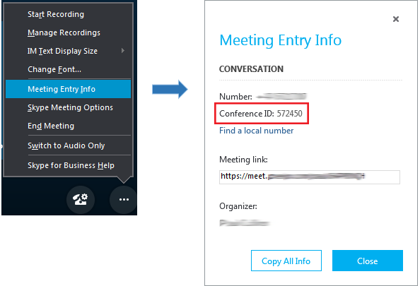 For ad hoc conferences, existing SfB participants in the conference can find the Conference ID by selecting the option (see picture).