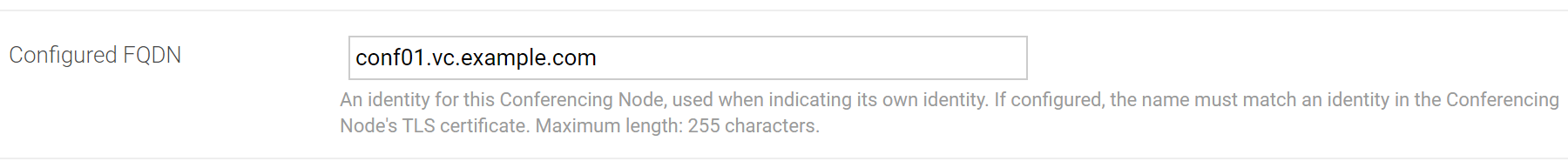 The example above shows the Configured FQDN for the conf01 Conferencing Node, which is set to conf01.vc.example.com.