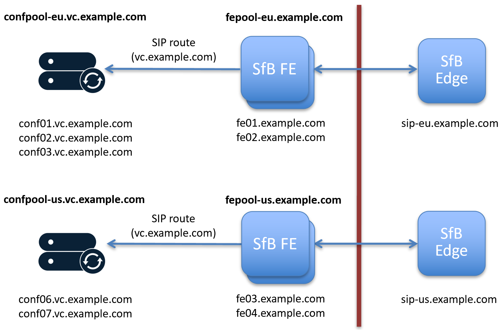 • 2 Conferencing Nodes conf06 and conf07 in System location US and to be placed in an application pool confpool-us.vc.example.com