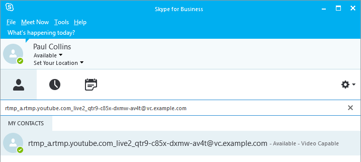 - SfB addresses in the format: youtube_<stream_name>@vc.example.com for example youtube_qtr9-c85x-dxmw-av4t@vc.example.com