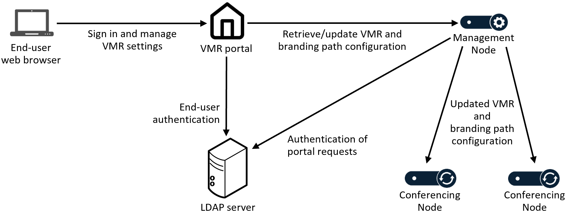 1. End-users sign in to the VMR portal via their web browser by supplying a username and password that is authenticated against an LDAP / Active Directory server. These are typically the same credentials they use to access their other applications within their organization.