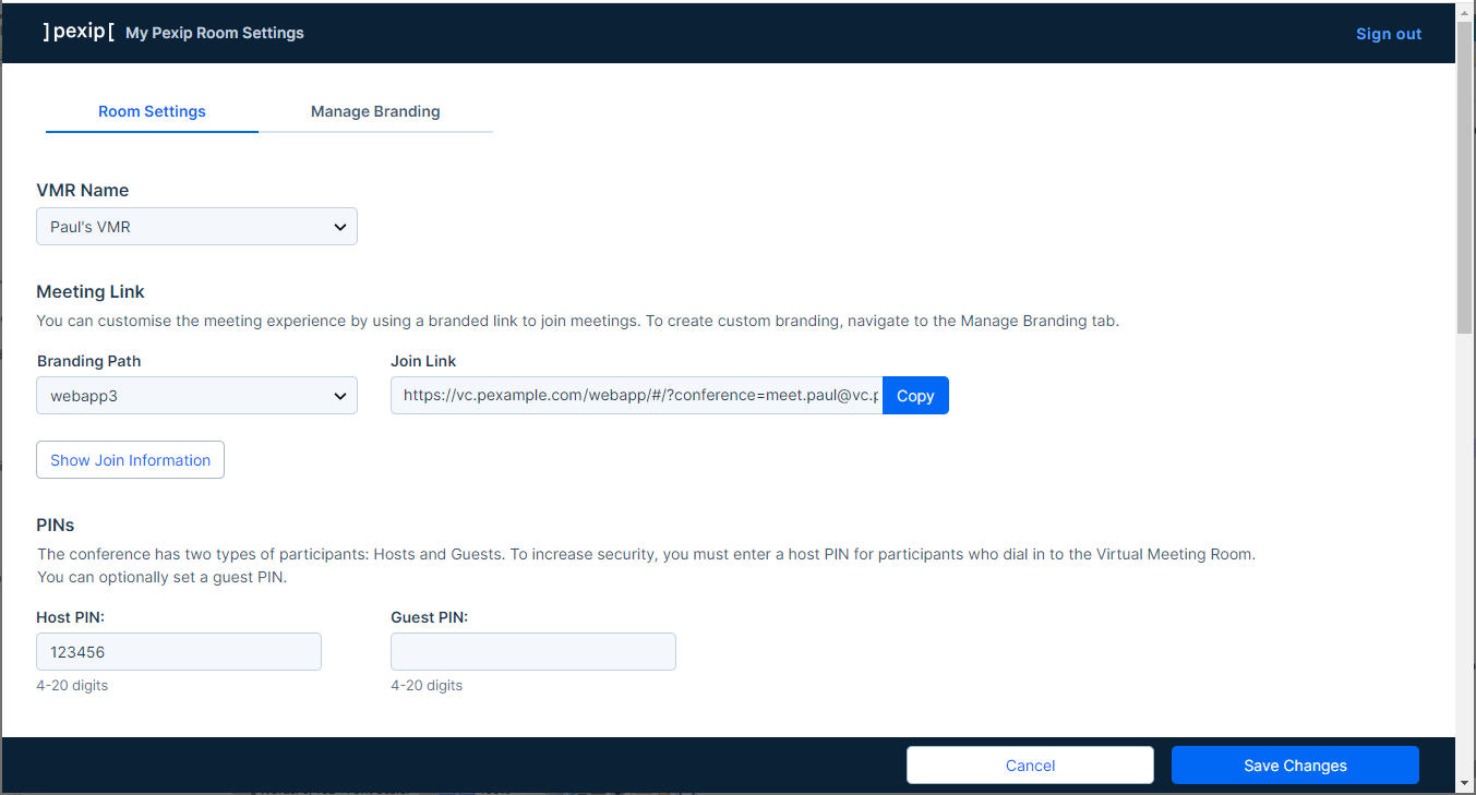 Using the VMR self-service portal — "My Pexip Room Settings"