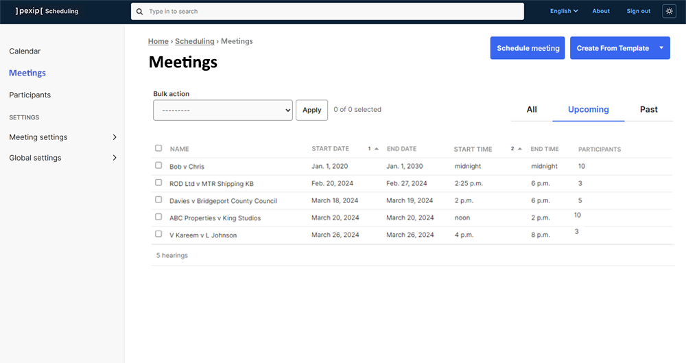 The Meetings page shows all meetings that you have been assigned to, or have access to view and/or edit based on permissions set by Access groups (Global settings) or administrator status. You can find details of all scheduled meetings, including meetings that have already finished. You can create a new meeting and edit or delete scheduled meetings.